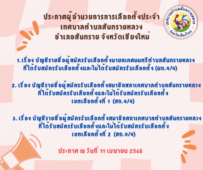 ประกาศผู้อำนวยการการเลือกตั้งประจำเทศบาลตำบลสันทรายหลวง [11/04/2568]
